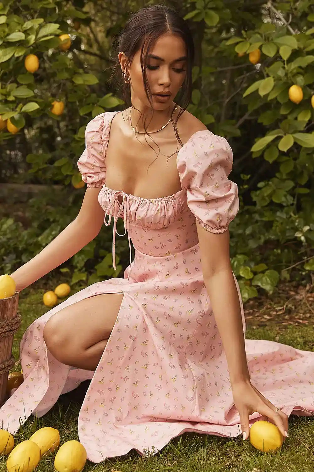 Com suas mangas bufantes e decote quadrado, esse vestido traz um toque vintage, enquanto a fenda frontal adiciona uma pitada de sensualidade e movimento ao look.