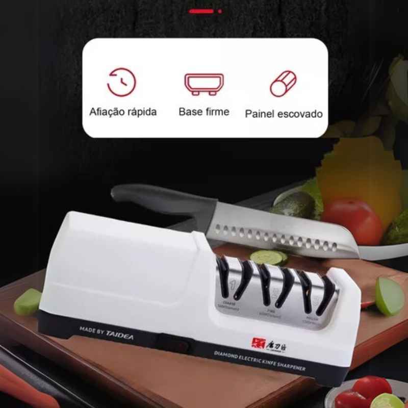- Praticidade Absoluta: Basta encaixar a faca e ligar o aparelho. Em segundos, suas lâminas estarão afiadas e prontas para uso.