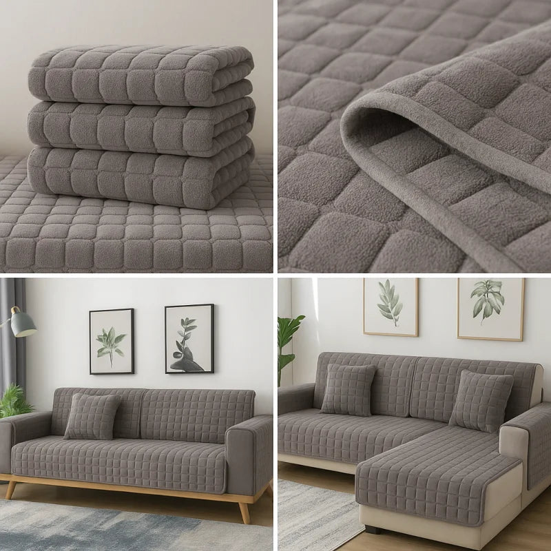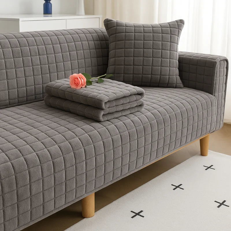 Fabricada com veludo de pelúcia premium e tecnologia antiderrapante avançada, esta capa combina funcionalidade superior com design requintado. Seu padrão xadrez clássico em tom cinza adiciona sofisticação ao ambiente, enquanto a textura espessada proporciona toque aconchegante e durabilidade incomparável.