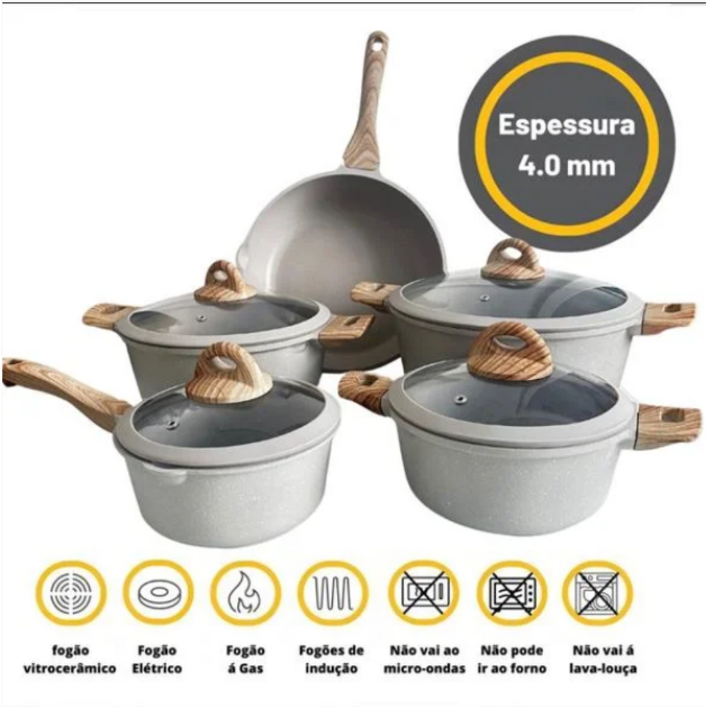 Além de contar com um revestimento nano cerâmico granite, que evita que os alimentos grudem, esse jogo de panelas é compatível com todos os tipos de fogões: